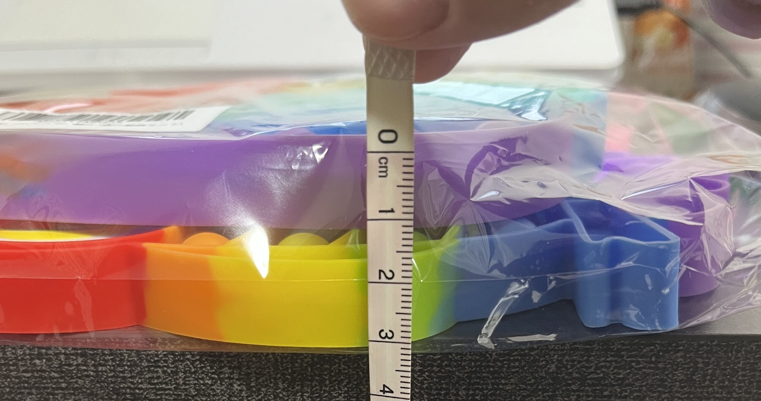 3点セットのプッシュポップはOPP袋での梱包時に厚みが約3cmなのです。すべて同じ方法・形で重ねてるのでそんなはずはないのです。