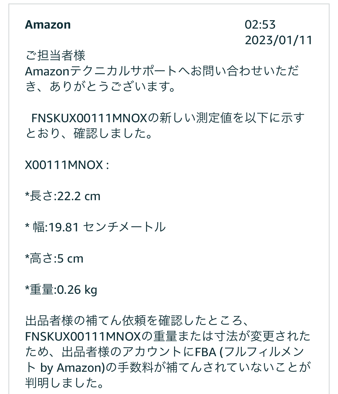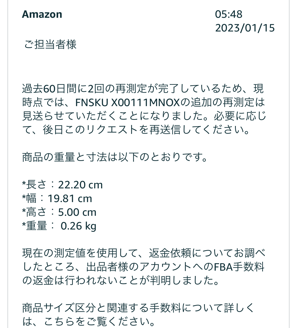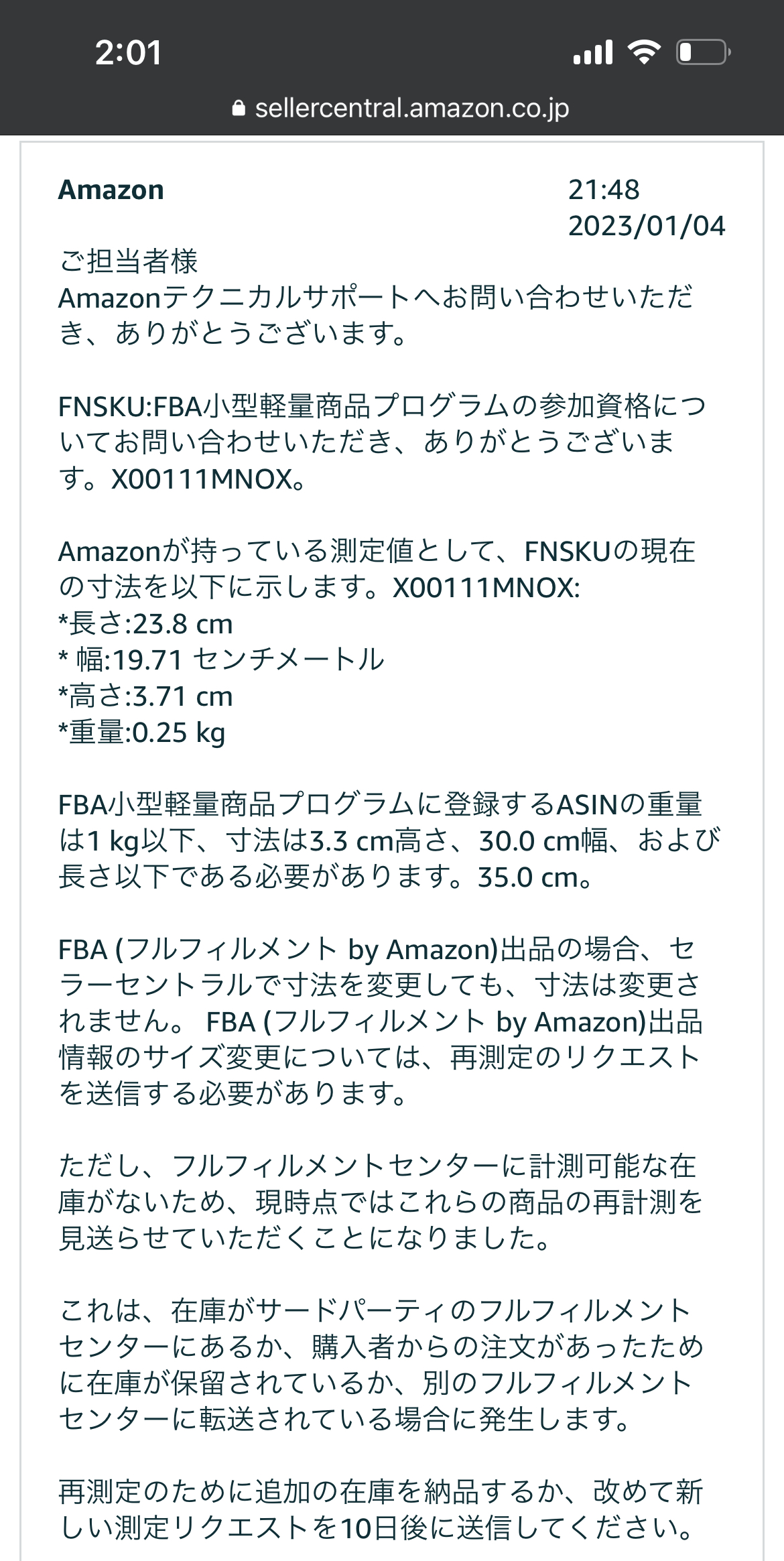 このようになりました。このデータは前回登録時のデータです。厚さ3.71cmですと。たしかに3.5cmを超えているので文句はいえません。このように特定のFBA倉庫に送っても在庫が少ない場合は計測できないことがあるようです。