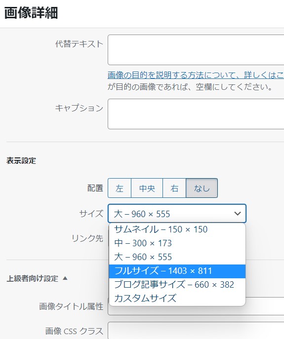 画像詳細に移動するので、中や大になっていた「サイズ」を『フルサイズ』に変更。