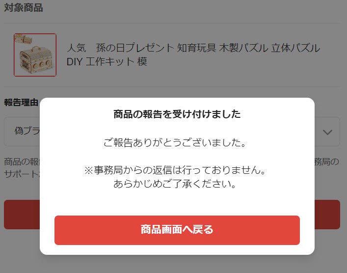 正義執行!報告終わりです。ただ返信がないということなので、いつ伝わり、いつ対応が済んだのかが分からないですね。このSHOPをフォローして熱く監視させていただきます。なおAmazonはものすごい早さで商品の削除を行ってくれます。