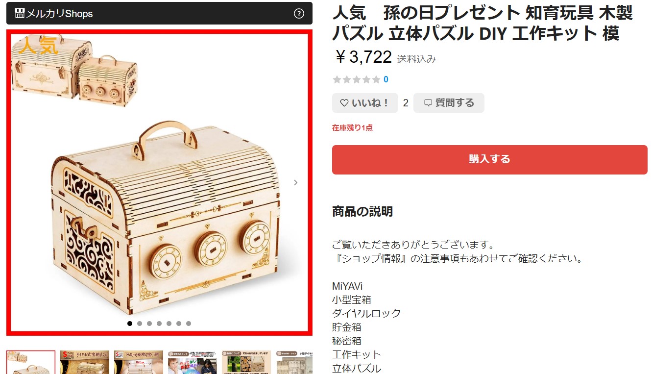 一応どこのセラーかは分からないようにしています。Amazonで1,799円で販売している私の小型宝箱です。孫の日プレゼントという普通では使わない名称をつけたタイミングで登録されたようです。よくそのまま使ったなと感心します。私もそんな日があるのをほぼ知らなかったですし。