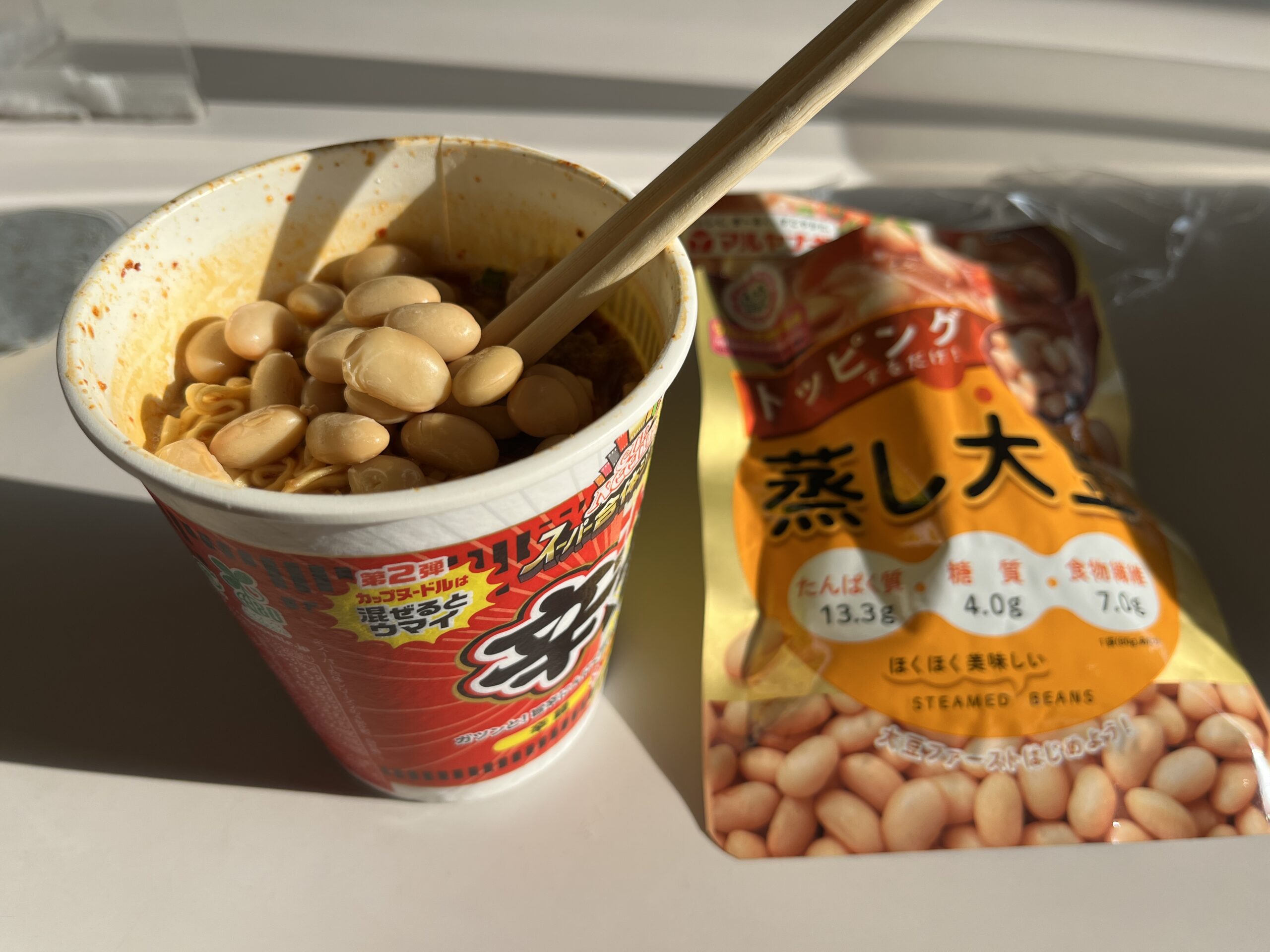 こんな感じでプラスすれば、普段少なくて物足りないカップ麺でもカロリーとたんぱく質を補えます。全部入れても+150kcalなので大したことはありません。物足りないからと、おにぎりとかコロッケなどを1品加えるくらいなら、こちらの方が糖質や脂質を抑えつつお腹も膨れていいと思います。スープに浸って味もつくので、大豆もより食べやすくなります。