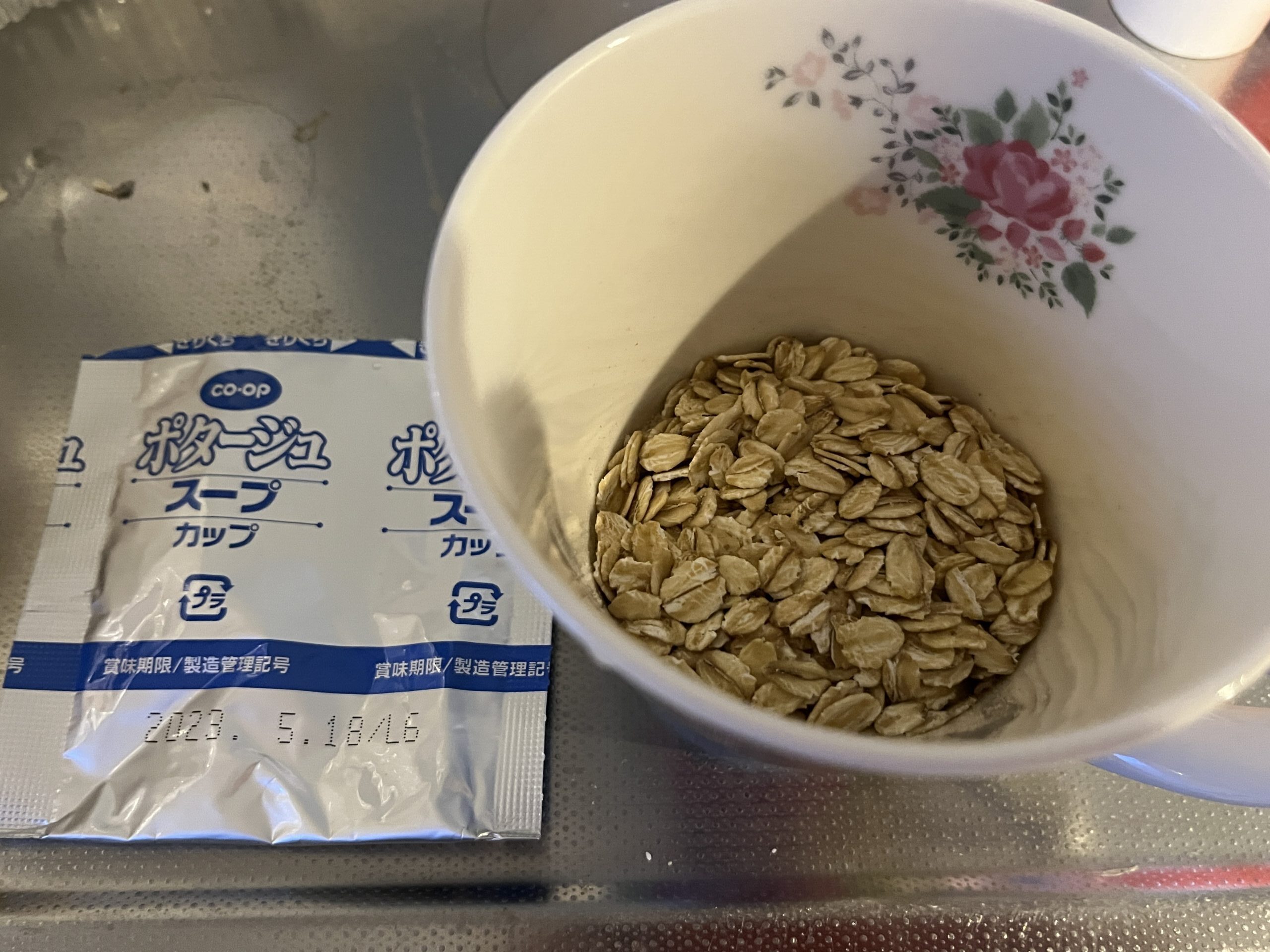 前置きが長くなりましたがここで結論です。朝のパンと一緒に飲むはずだった、ポタージュ系のカップスープとともにオートミールを混ぜて飲むのが、美味しく食べてダイエットするのに最適と分かりました。