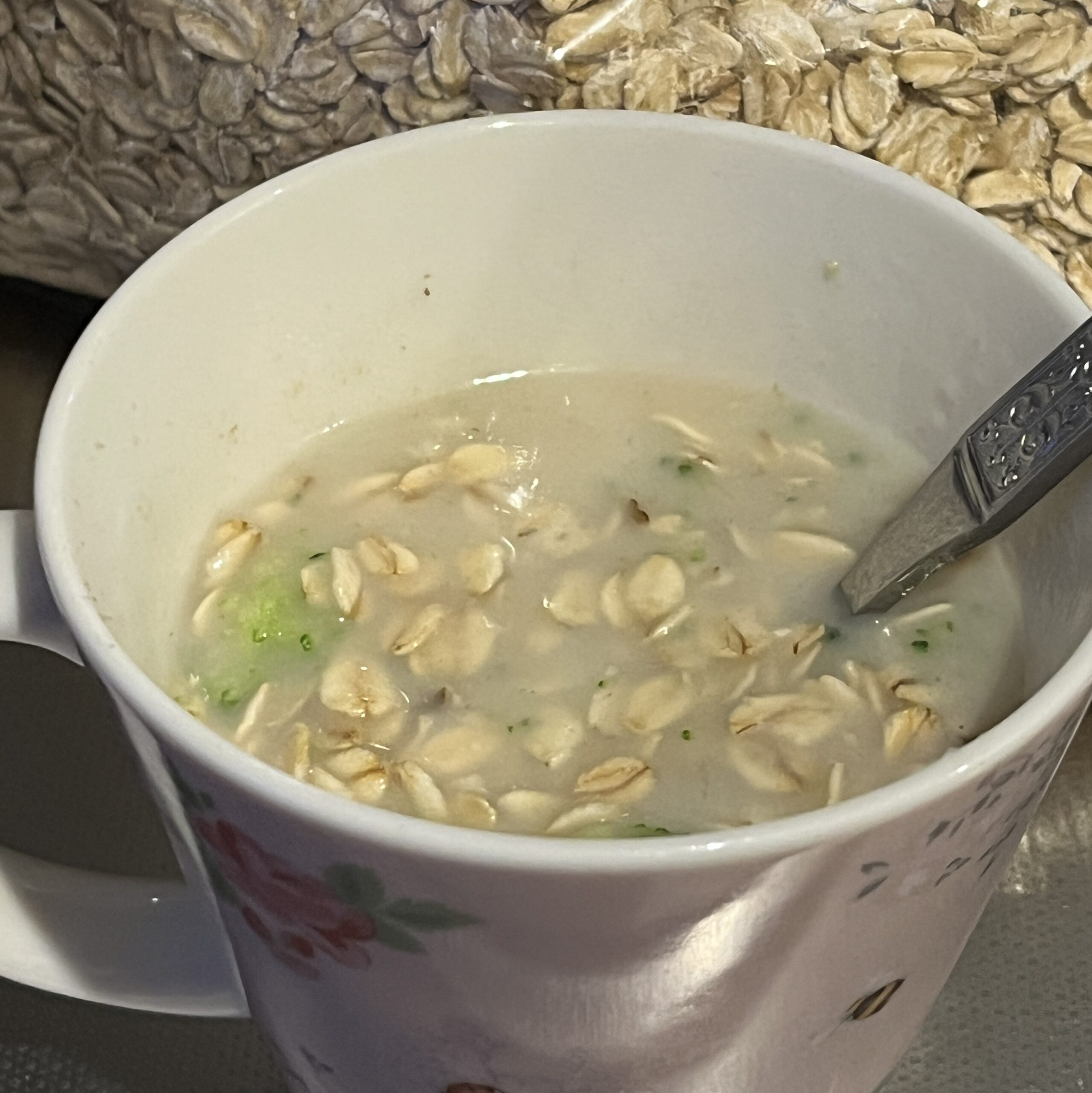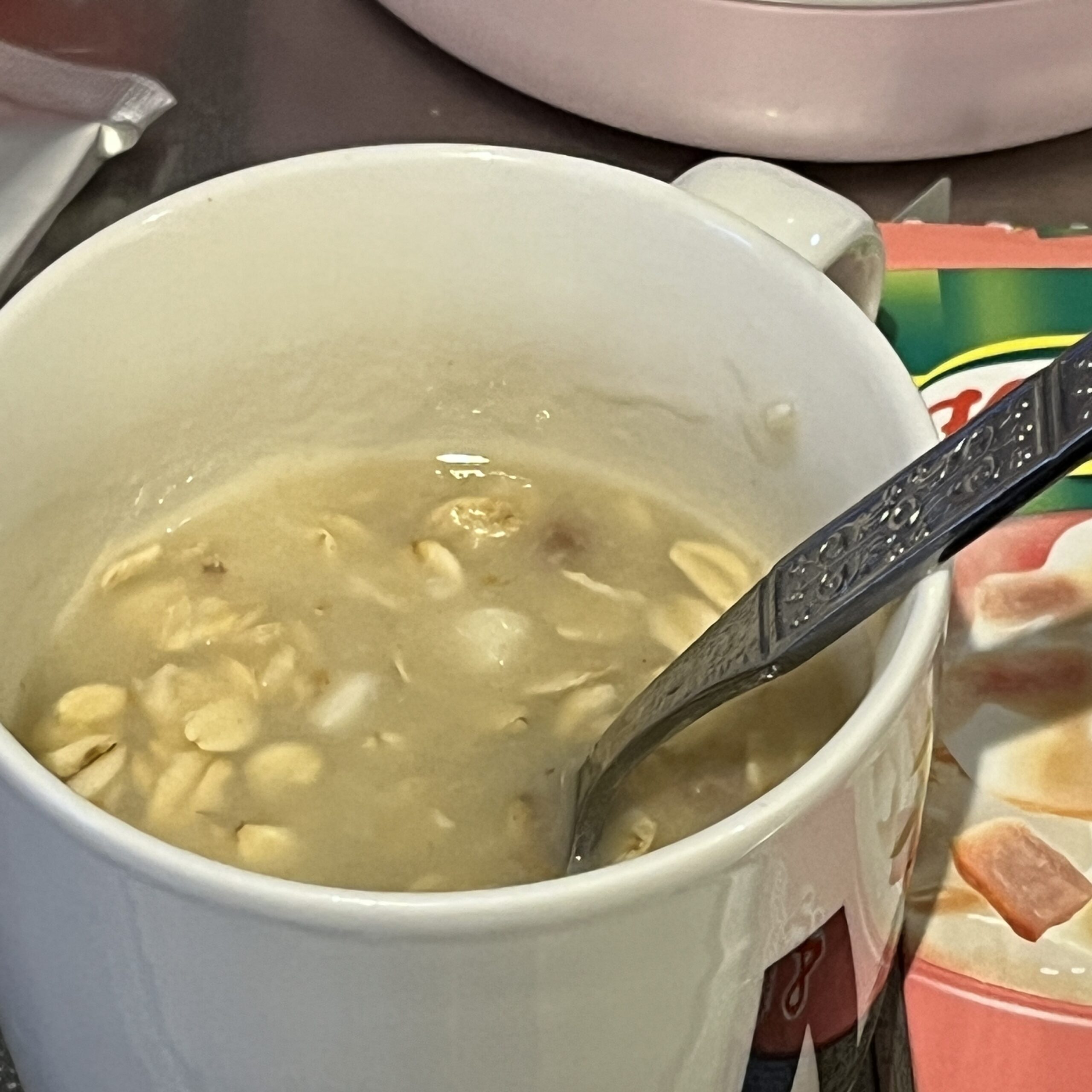 スープと一緒にオートミールを大さじで3~4杯入れ、熱湯を入れて15秒ではなく、とことんかき混ぜてから5分ほど待ちます。本来は1分でしょうけど、どうせ熱くて飲めないし、時間をかけるとしっかりとふやかされて粉っぽさが無くなり、かき混ぜると底に沈むことなくいい感じに絡みます。これはおススメ!