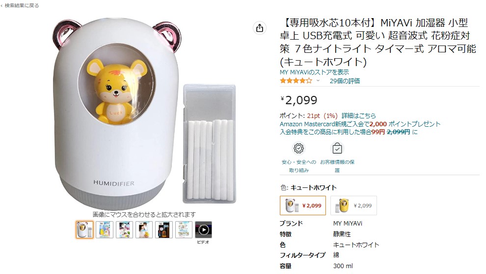 小型加湿器です。黄色と白があります。2,099円が15%Offの1,780円です。替えの芯10本ついてUSB充電式でこのお値段って破格だと思うのです。箱が弱くて配送時によく潰されているのが低レビューに繋がっていて悔しいです。商品自体の性能はとてもいいと思っています。