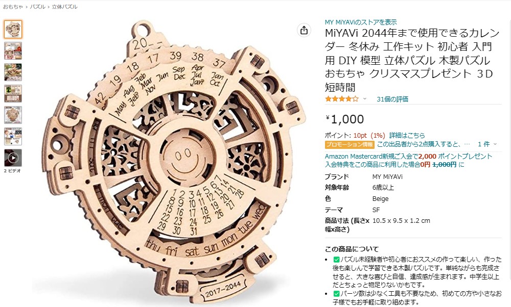 こちらはカレンダーです。プライム会員の方は900円になります。冬休みの工作にどうぞ。