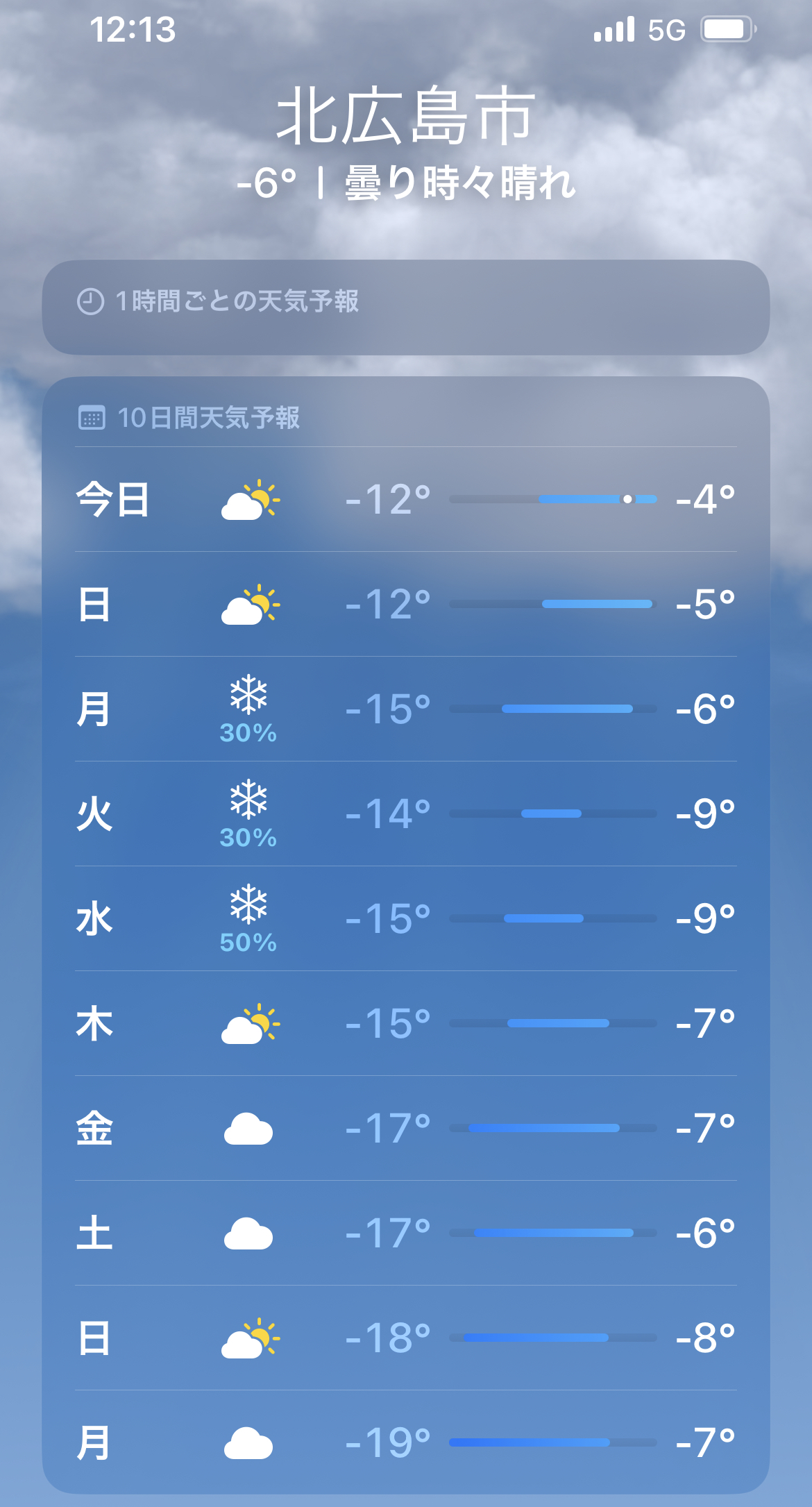 …関東や関西と比べたら、寒暖差はそこまでありませんが、ここ数週間と比べるとちょっと長いですね。ここまで最低気温の低い日が続くのはあまり記憶にありません。後半のマイナス19℃って初めてだと思います。
