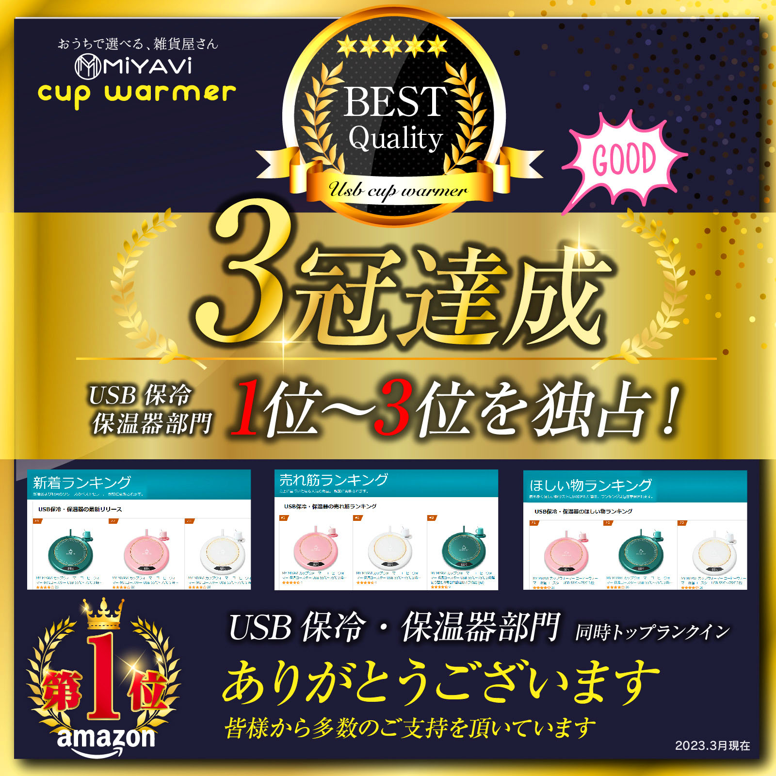 予想外に売れ行きのいいこちらのカップウォーマーですが、「新着」「売れ筋」「ほしいもの」3つの各ランキングをキャプチャーして事実に基づいてこちらの画像を作成してもらい、差し込んでいたのです。