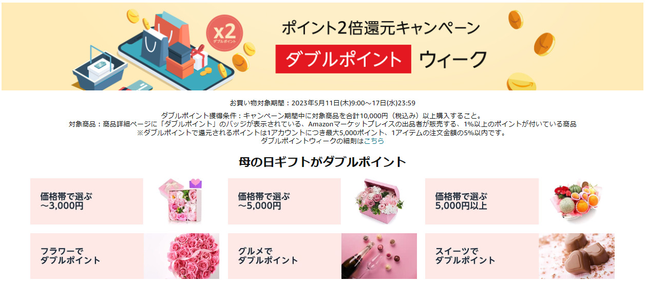 今回は母の日ギフト関係が多いみたいなので、ぜひ感謝の贈り物のお買い物をしつつ、自分のポイントをしっかりと貯めましょう。