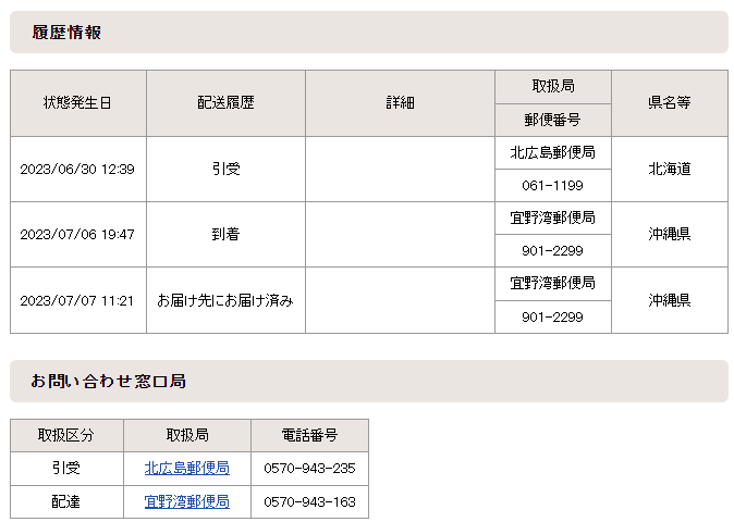 ただ、今までになかった沖縄への配送の場合、何日で着くのか非常に気になりました。