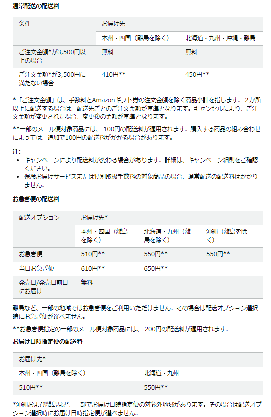 なお通常の配送料やお急ぎ便での配送料は下記のとおりです。