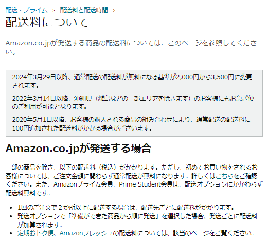 プライム会員なら問題ありませんが、このように3,500円以上のお買い物をしなければ配送料が無料にならなくなりました。