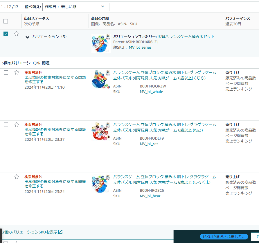 Amazonのテクニカルサポートに聞いたら、親Asinと呼ばれるものと子Asinの名前が違うからバリエーションが解体され、出品してても検索されずに売られなくなったとのこと。