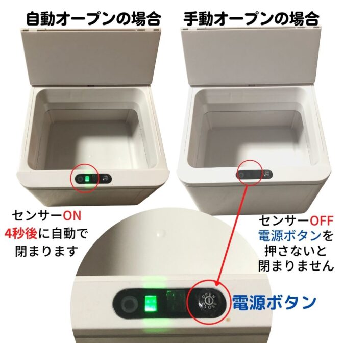 ②電源ボタンを2秒ほど押すと電源が入ります。電源が入ると正面のランプが2回光ります。センサーに手をかざすとランプが点灯し、ふたが開きます。開いている間はランプは点灯し続けます。4秒後に自動でふたが閉まります。 なお手動で使う際は電源が入った状態で電源ボタンを押してください。フタが開き、ランプは消灯します。消灯中はフタはしまりません。