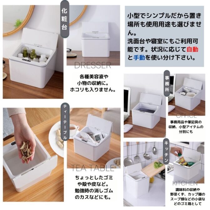 自動のセンサーで折り畳み式の蓋を開閉できる小型のゴミ箱です。使用方法により、ボタンで手動への切り替えも可能です。 マスクの収納ケースとしてもご利用いただけます。