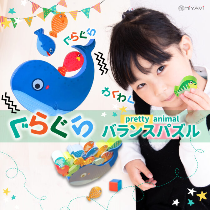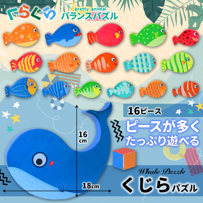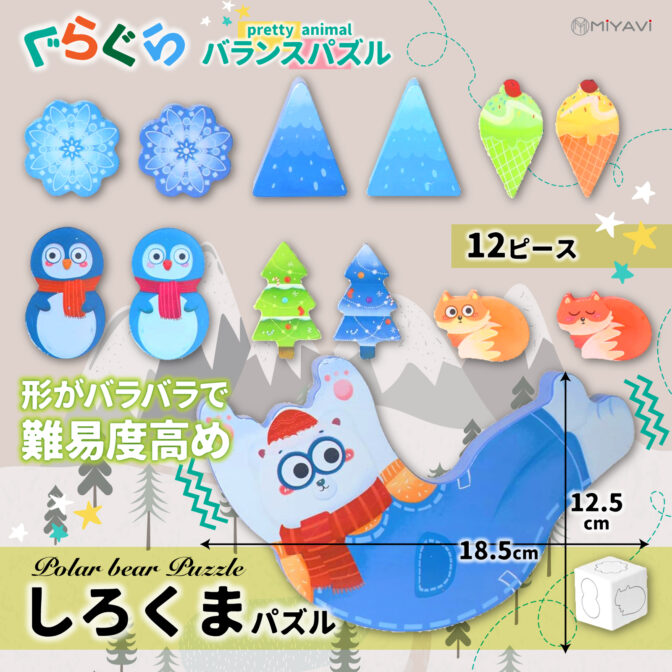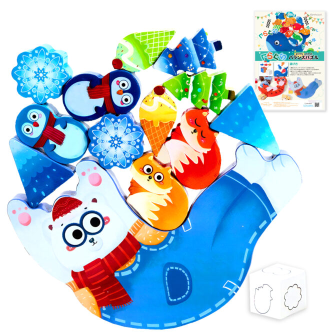 - 木製の積み木で作られた面白いバランスゲームです。3つのバリエーションがあり、それぞれに特徴があります。ベーシックで初心者向けの「くじら」、少し難易度があがる中級者向けの「ねこ」、より刺激的な「しろくま」と、年齢層やレベルに応じてお選びいただけます。