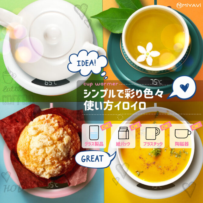 - ガラス、紙容器、プラスチック、セラミック、ホーロー、シングルタイプのステンレスマグなどに対応しています。いずれにしても底面全体で温めるため、カップの形状が平たくない場合や窪みがある場合は温まりにくいことがあります。缶飲料は熱伝導性は高いですが、接地面積がほとんどないので機能を活かせません。