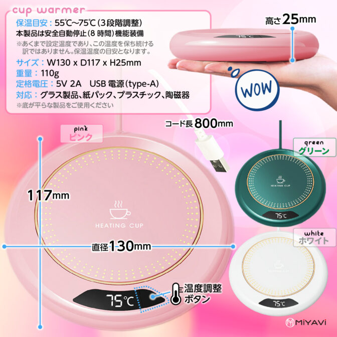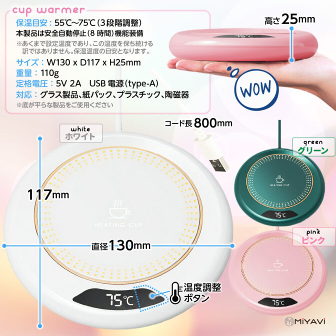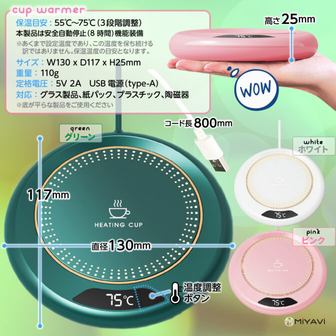 【2025年版】カップウォーマー コーヒーウォーマー 保温コースター USB 55℃~75℃3段階切り替え 8時間自動電源オフ機能